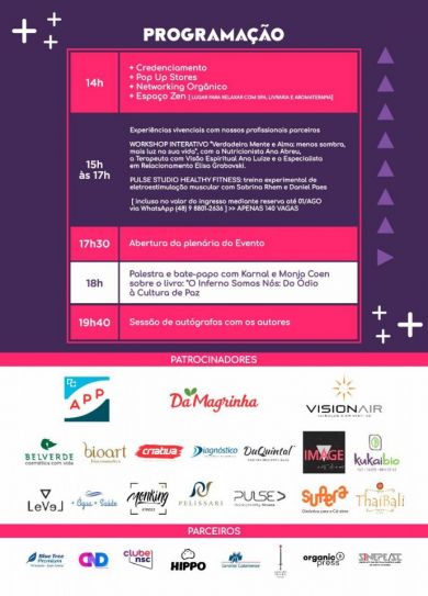 Das 15 às 17 horas vai acontecer o Workshop “Verdadeira Mente e Alma: Menos Sombra, Mais Luz na Sua Vida” com as palestrantes: a Nutricionista Ana Carolina Abreu, a Terapeuta com Visão Espiritual Ana Luize e a Especialista e Master Coach em Relacionamento Elisa Grabovski.