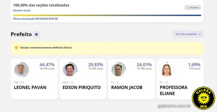 O candidato venceu Edson Piriquito, que teve o segundo lugar com 29,83% dos votos, totalizando 12.549 votos.