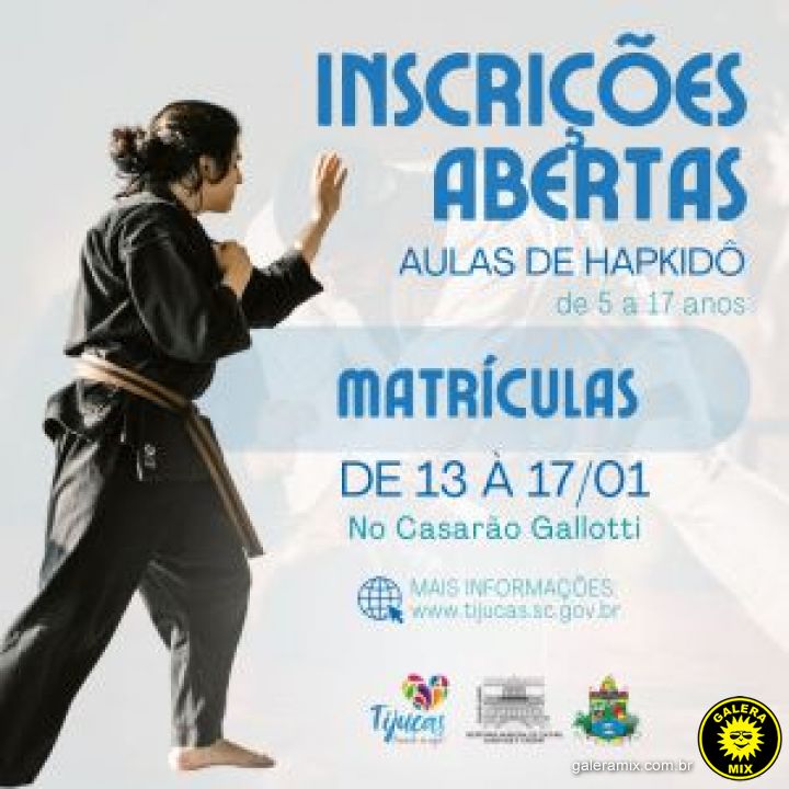 A Prefeitura Municipal de Tijucas, por meio da Secretaria de Cultura, Juventude e Turismo, informa que estão abertas as matrículas para as oficinas de Hapkidô e Jiu-Jitsu, que acontecem no Casarão Gallotti. As oficinas são voltadas para crianças e jovens, promovendo aprendizado, disciplina e desenvolvimento físico.