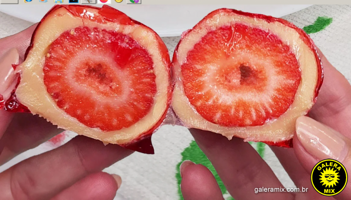 Esse doce de morango tem uma casquinha vermelha de açúcar que fica crocante por fora e um recheio de brigadeiro de leite ninho, muito cremoso, docinho e saboroso. O morango deixa tudo ainda mais gostoso.
