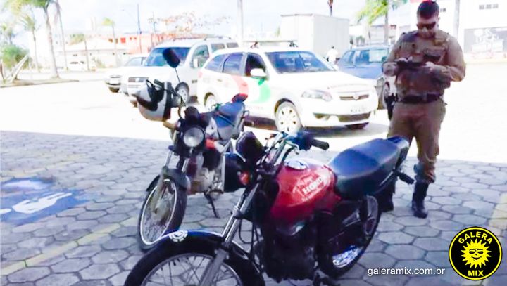 Uma motocicleta foi apreendida no estacionamento de uma loja, por volta das 12h desta terça-feira04-09, na Av. Emília Ramos, conhecida como P4, no bairro Universitário, em Tijucas.