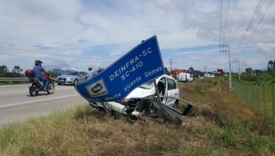 Um acidente de trânsito no fim da manhã desta quarta-feira (13), na SC-410, deixou um motorista ferido, no Bairro Joáia, em Tijucas. O condutor do VW/Gol, de Porto Belo, invadiu a faixa contrária, colidiu na lateral dianteira de um caminhão, que vinha no sentido contrário, e parou após bater em uma placa de sinalização na beira da estrada.