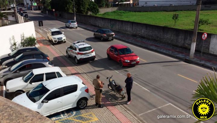 Mulher fica ferida em acidente envolvendo carro e moto no centro de Tijucas