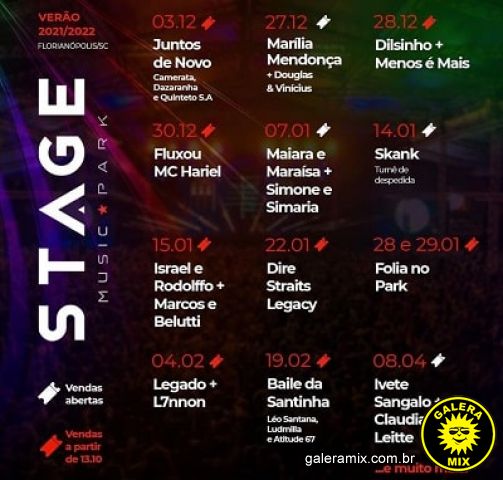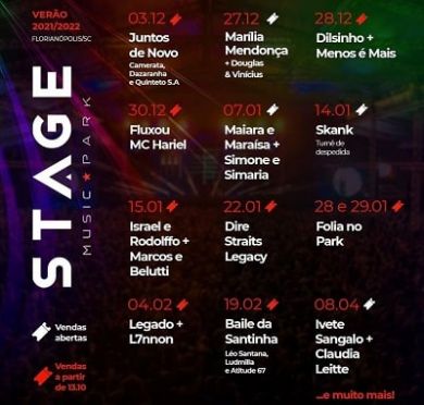 Pouco mais de um ano e meio depois de parar todas as operações, em respeito às determinações do governo para combater a Covid-19, o Stage Music Park, em Florianópolis, está de volta e anuncia diversos shows ecléticos para a temporada, entre eles: Alceu Valença, Marília Mendonça, Skank, Israel e Rodolffo, a banda britânica Dire Straits Legacy, Ludmilla, Ivete Sangalo e Claudia Leitte e muito mais.