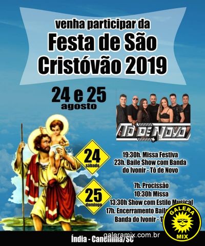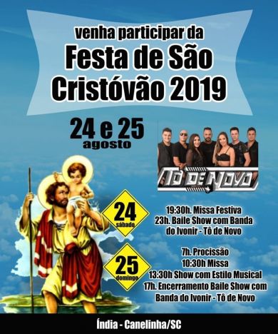 Nos dias 24 e 25 de agosto, no bairro da Índia em Canelinha, acontece mais uma edição da tradicional Festa de São Cristóvão , popularmente conhecida como Festa do caminhoneiro.