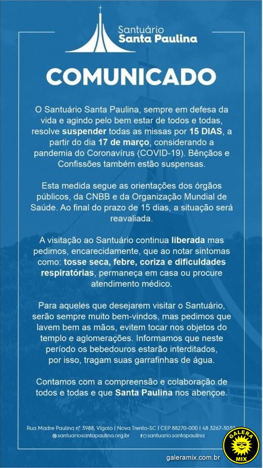 O Santuário Santa Paulina, localizado no bairro Vígolo, em Nova Trento, informa a suspensão de todas as suas celebrações, pelo período de 15 dias, devido a atual situação de cautela, quanto a proliferação do Covid-19 (Coronavirus), haja visto a grande circulação de pessoas vindas de todas as partes do Brasil, e até de outros países, frequentemente ao local.