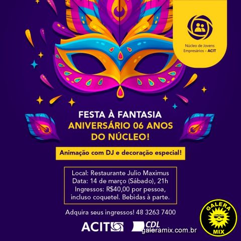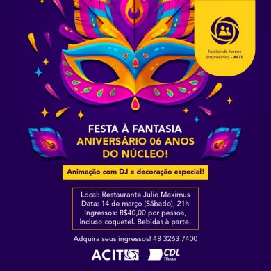 O Núcleo de Jovens Empresários da Acit/Cdl Tijucas comemora seis anos de atividades e para celebrar vai promover uma festa à fantasia no próximo sábado (14). O evento acontece no restaurante Julio Maximus, a partir das 21h, e os ingressos estão sendo vendidos pelos nucleados. O evento serve para comemorar a trajetória de um grupo que trabalha para fomentar o empreendedorismo entre os jovens e contribuir com o impulsionamento da economia local. Os ingressos custam R$ 40 (quarenta reais) e dão direito ao coquetel que será servido durante a festa. As bebidas serão cobradas à parte.