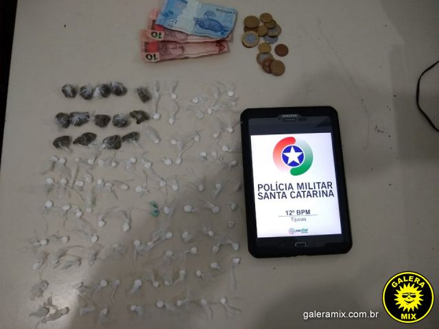 Com L. M. A. S. foi encontrado no bolso direito da calça 5 petecas de cocaína e 5 buchas de maconha, no bolso esquerdo o total de R$ 27,55. Diante dos fatos a guarnição de voz de prisão ao agente maior de idade e apreensão para menor, conduzindo-os até a Delegacia de Polícia Civil de Itapema, juntamente com a droga e mochila apreendida.