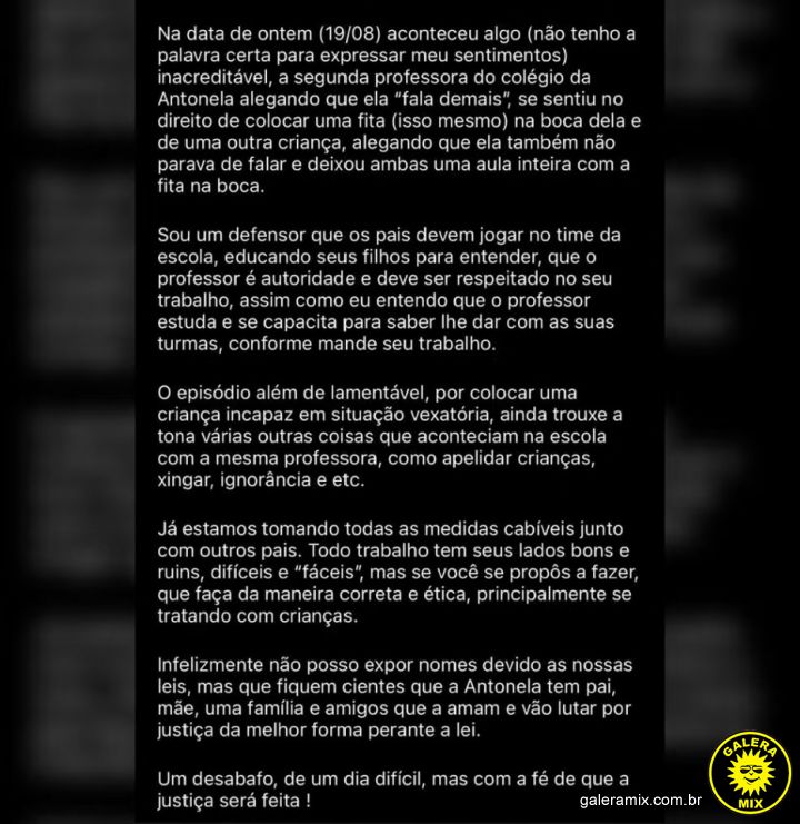 Segundo os pais de uma das meninas, as crianças passaram a aula toda com a fita na boca. E a professora alegou ser parte de uma "brincadeira do silêncio".