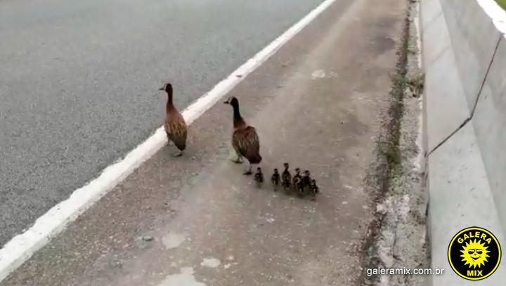 Na manhã desta quinta-feira (30), uma família de patos parou o trânsito na BR-101 em Tijucas. Com auxílio da Autopista Litoral Sul, os animais conseguiram atravessar a rodovia em segurança.
