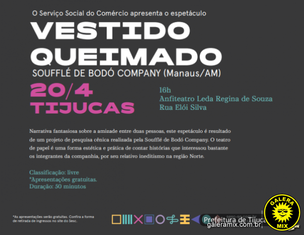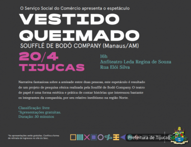 No próximo sábado (20) acontece em Tijucas um espetáculo intitulado “Vestido Queimado”, da companhia amazonense Soufflé de Bodó. A peça, que explora com inventividade a linguagem do Teatro de Papel, acontece a partir das 16h no Anfiteatro Leda Regina de Souza.