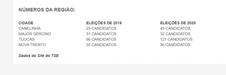 Com isso, São João Batista tem neste ano 11 candidatos para cada uma das 11 cadeiras da Câmara Municipal. Nas demais cidades da região o número também aumentou. (Confira a tabela abaixo).