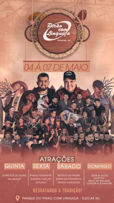 Nos próximos dias 4, 5, 6 e 7 de maio, acontece uma super festa no parque do Pirão com Linguiça. Embora se intitular Pirão com Linguiça, o evento não está sendo organizado pelos donos do