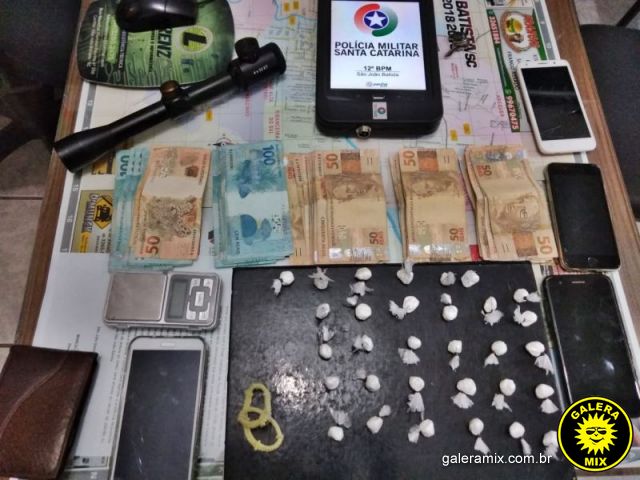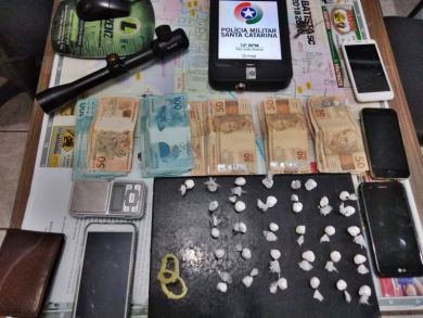 No local foi localizado mais 28 buchas de cocaína, R$ 4.900,00 (em notas de 50 e 100), 1 balança de precisão e 1 luneta que era utilizada para prever e acompanhar a chegada da PM.