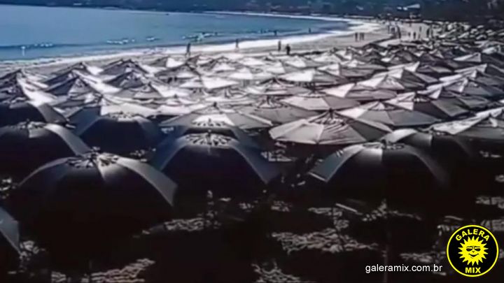 Em um dos registros, é possível observar uma extensa área da praia ocupada por guarda-sóis de mesma cor, sugerindo uma possível ação coordenada de comerciantes na faixa de areia. Em outro vídeo compartilhado por um leitor, a praia apresenta uma configuração peculiar, com guarda-sóis azuis, pretos e brancos dominando o cenário, dificultando a livre circulação de banhistas.