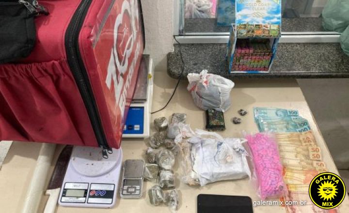 Com apoio de outra equipe, os policiais localizaram na casa do suspeito 716g de cocaína, 213g de maconha em 11 porções, 500 comprimidos de ecstasy, 94g de haxixe e 66 refis de pod com THC. Também foram apreendidos uma motocicleta, um veículo, dinheiro em espécie, balanças de precisão e materiais usados para embalar drogas.