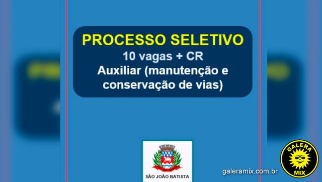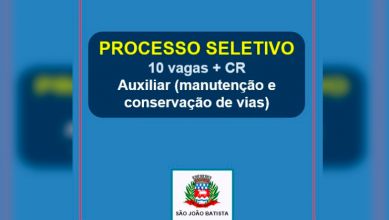 A administração municipal de São João Batista informa que estão abertas as inscrições para 10 vagas temporárias, além de formação de cadastro de reserva, para auxiliar de serviços gerais (manutenção e conservação de vias). Os cargos serão preenchidos por meio do Processo Seletivo Simplificado nº 03/2020, cujo Edital pode ser conferido clicando aqui.