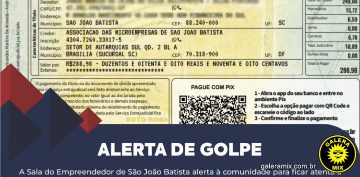 Conforme relatos, as correspondências apresentam falso cartão de notificação extrajudicial, em nome de uma inexistente “Associação de Microempresas de São João Batista”, com um QR Code para pagamento de uma taxa via PIX. Apesar de se apropriar de símbolos oficiais, o documento é falso. Conforme destaca a Secretaria Municipal de Desenvolvimento Econômico, a Sala do Empreendedor não efetua este tipo de cobrança.