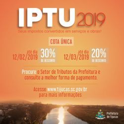 Começa a partir da próxima segunda-feira (14) a distribuição dos carnês do IPTU 2019 (Imposto Predial e Territorial Urbano) de Tijucas. Os carnês serão distribuídos casa a casa e contêm os boletos para pagamento em cota única, tendo o primeiro vencimento em 12 de fevereiro, com desconto de 30%, e a segunda cota única, com 20% de desconto e vencimento em 12 de março.