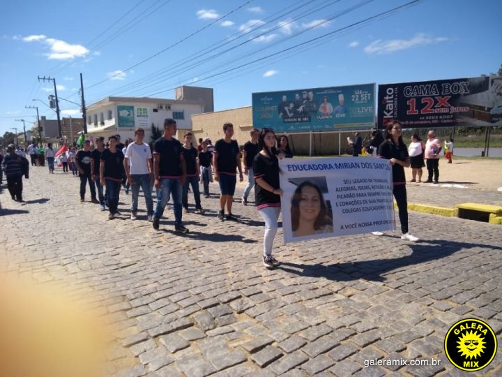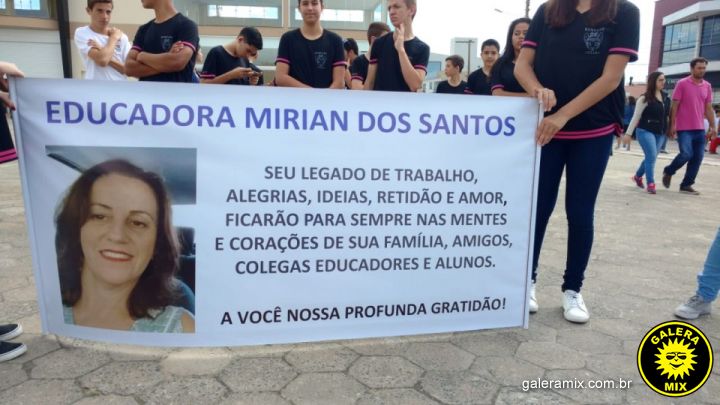 A professora da Rede Municipal de Ensino de Tijucas Miriam Santos, que faleceu no último dia 5 de agosto, vítima de câncer. Foi lembrada no desfile cívico em Tijucas na manhã desta sexta-feira (7), com um cartaz em sua homenagem.