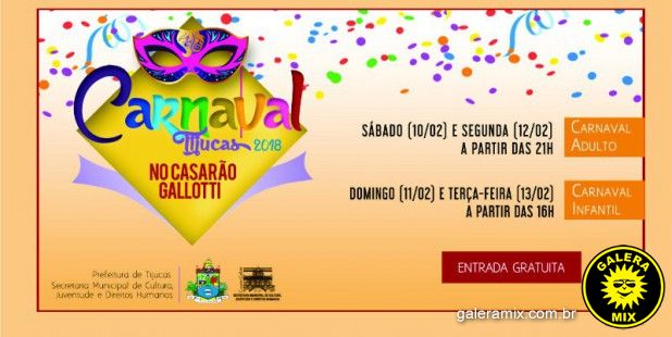 - 12 /02 Carnaval de Tijucas no Casarão Gallotti (adulto), a partir das 21h;