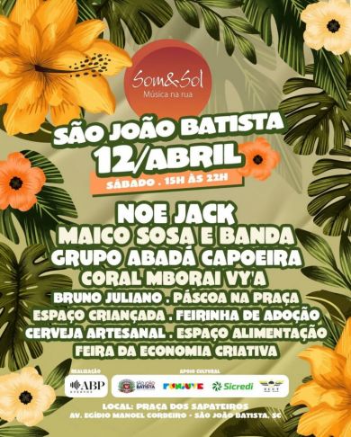Há praticamente oito anos, o Som&Sol - Música na Rua trabalha no fomento à economia criativa e para democratizar o consumo de cultura na região do Vale do Rio Tijucas e litoral-norte. E já há bastante tempo, a organização do projeto ansiava por realizar uma edição em São João Batista, desejo que enfim se cumpre no dia 12 de abril (sábado). O evento é totalmente gratuito e ocorre na Praça dos Sapateiros, das 15h às 22h, com uma programação repleta de música, artesanato e intervençõ