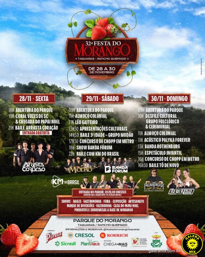 A comunidade de Taquaras, em Rancho Queimado, se prepara para receber a 32ª edição da tradicional Festa do Morango, que será realizada entre os dias 28 e 30 de novembro de 2025, no Parque do Morango.