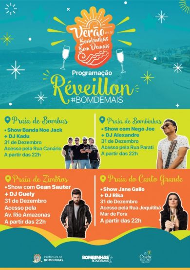 Para comemorar a chegada de 2020, bandas e DJ’s da região vão embalar o ano novo em Bombinhas. A Prefeitura, por meio da Secretaria de Turismo e Desenvolvimento Econômico – Setur, vai montar palcos para os festejos em quatro das principais praias da cidade: Bombas, Bombinhas, Canto Grande e Zimbros. As apresentações são gratuitas e acontecem a partir das 22h do dia 31.
