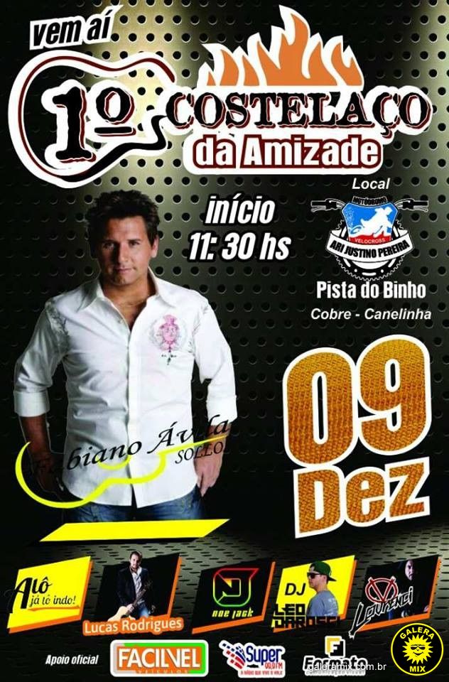 Neste sábado, dia 9 de dezembro, acontece o 1º Costelaço da Amizade, no Motódromo Ari Justino Pereira, Pista do Binho, no bairro Cobre em Canelinha. O evento terá início ás 11h30min, com muitas atrações: