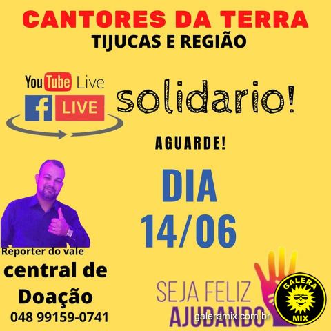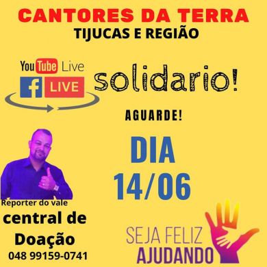 A live solidaria dos artistas da terra, que será transmitida do Rancho Limeira em Tijucas e acontecerá no próximo dia 14 de junho. Também oferecerá um delicioso carreteiro, no valor de R$ 15,000, onde parte da renda será revertida na compra de cestas básicas. Para garantir a sua fitinha para o carreteiro, entre em contato pelo whatsapp: (48) - 9-9159-0741.