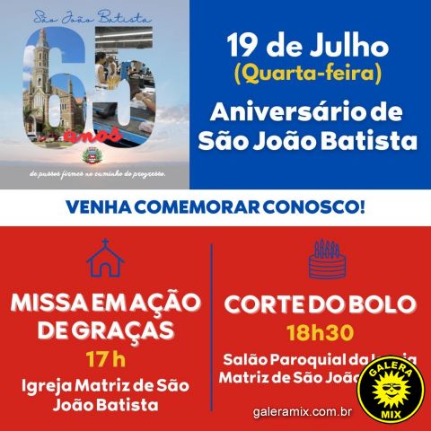 São João Batista completa 65 anos de emancipação político-administrativa nesta quarta-feira (19). E, para comemorar, uma programação especial foi preparada para a data, que é feriado municipal. Às 17h, na Igreja Matriz, será realizada a Missa em Ação de Graças. E, às 18h30, no Salão Paroquial da Igreja Matriz, o tradicional Corte do Bolo de Aniversário da Cidade.