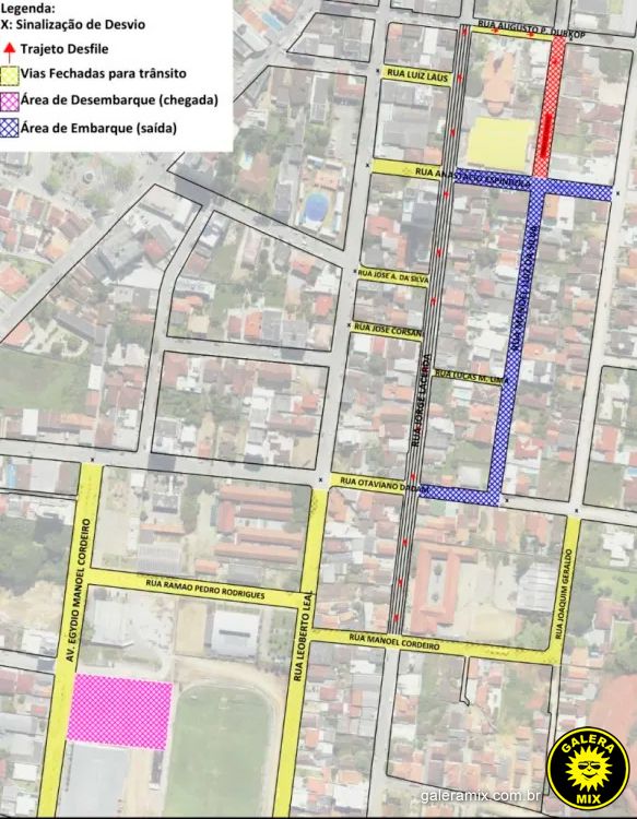 A partir das 13h será proibido o estacionamento na rua Jorge Lacerda. Bloqueio temporário em algumas quadras da mesma via, para pintura das faixas para o desfile.