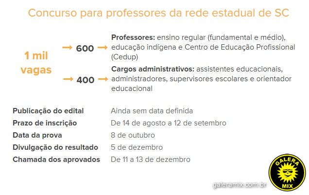 A Secretaria da Educação de Santa Catarina abrirá inscrições do concurso para contratação de 1 mil professores efetivos para a rede estadual de ensino a partir do dia 14 de agosto. Serão 600 vagas destinadas a professores do ensino regular (fundamental e médio), educação indígena e para os Centros de Educação Profissional (Cedups).