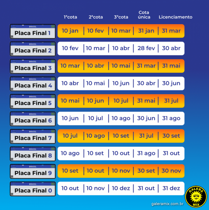 Em cota única, o imposto deve ser quitado até o final de cada mês – o prazo para placas com final 1 vai até 31 de janeiro.