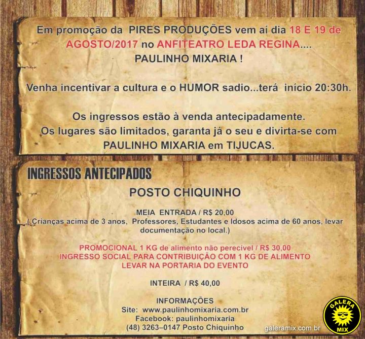 Vem aí nos dias 18 e 19 de agosto no ANFITEATRO LEDA REGINA... PAULINHO MIXARIA !