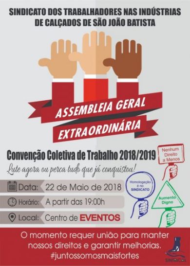 O Sindicato dos Trabalhadores da Indústria Calçadista convida a todos os Trabalhadores nas Indústrias de São João Batista para Assembleia Geral extraordinária que será realizada na noite desta terça-feira dia 22 a partir das 19h00 no Centro de eventos.