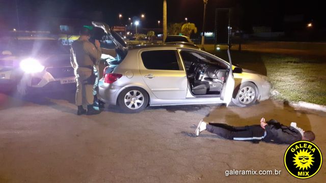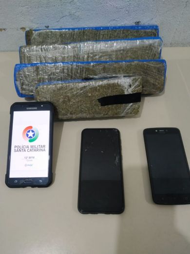 Diante da fundada suspeita os policiais realizaram a abordagem, que neste momento estavam no veículo dois ocupantes, sendo identificados como o condutor M. J. R., 25 anos, e o passageiro foi identificado como L. D. P., 25 anos. Em revista ao veículo foi encontrado no lado do passageiro onde estava L. uma mochila contendo 3kg de substância análoga a maconha já embalada para comercialização. Em cima dos bancos estavam dois aparelhos celulares.