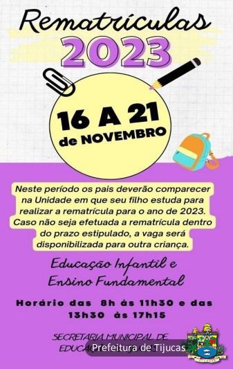 A secretaria municipal de Educação de Tijucas comunica o lançamento do período de rematrículas de alunos da Rede Municipal de Ensino para o ano letivo de 2023, tanto para Educação Infantil quanto para o Ensino Fundamental.