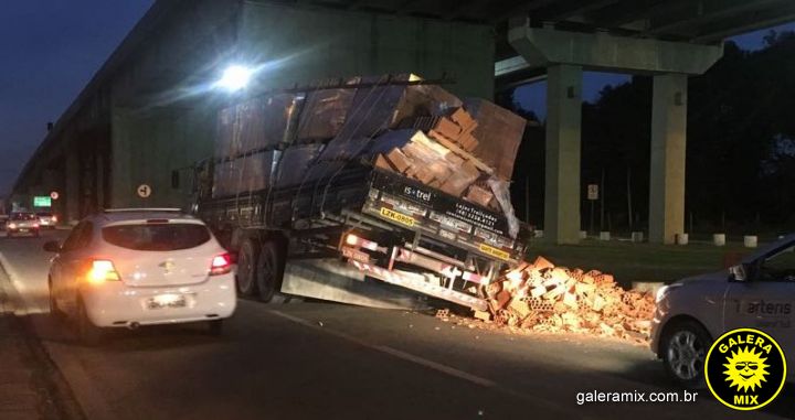 Parte da carga de um caminhão carregado de tijolos tombou na região central de Tijucas no início da noite de segunda-feira (11).