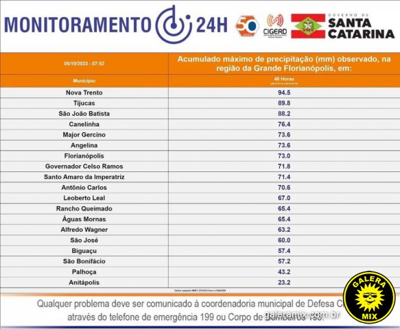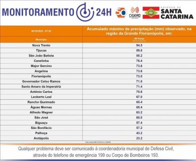 De acordo com dados do Centro Integrado de Gerenciamento de Riscos e Desastres de Santa Catarina, o município de Tijucas foi o que apresentou o segundo maior índice de acumulado de chuvas nas últimas 48 horas, com total de 89.8 mm. O maior volume na região foi registrado em Nova Trento com total de 94.5mm.