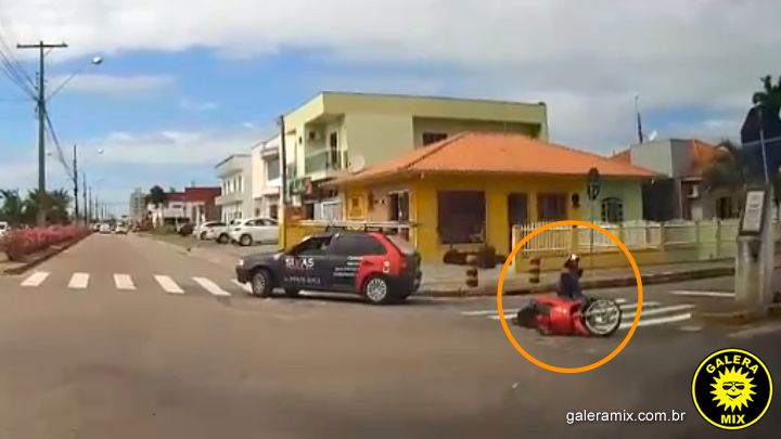 O automóvel já estava no meio do cruzamento e nem chegou a frear ao atingir a pessoa que conduzia a Honda/Biz. A vítima foi arremessada com o impacto da colisão.