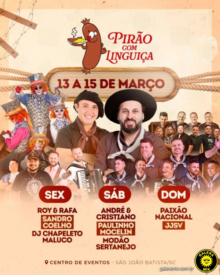 A Festa do Pirão com Linguiça 2026 já tem data, local e programação musical confirmadas e promete movimentar São João Batista entre os dias 13 e 15 de março de 2026, no Centro de Eventos do município. A nova edição marca a transferência oficial do evento para a cidade e aposta em estrutura ampliada e shows nacionais e regionais para atrair público de toda a região.