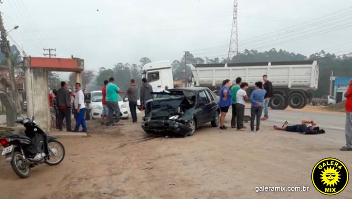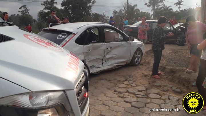 A colisão lateral envolveu um GM/Santana e um Ford/Focus na rodovia SC-410, no bairro Nova Descoberta.