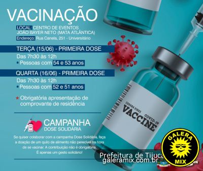 A Secretaria Municipal de Saúde de Tijucas segue com a vacinação contra a Covid-19 e nesta terça-feira (15) inicia a imunização de pessoas com 54 e 53 anos.