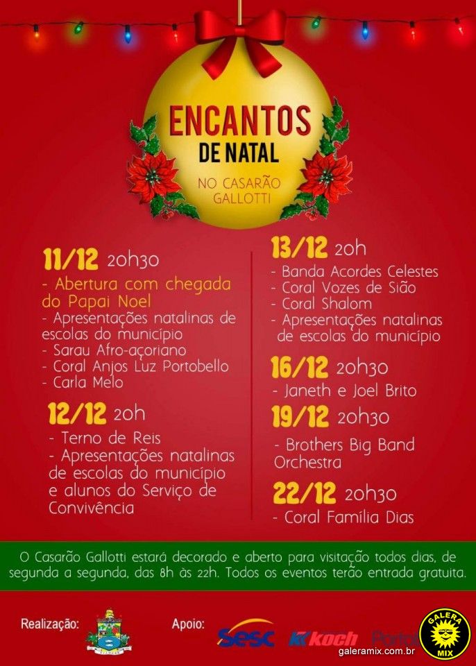 Dia 11/12 (segunda-feira) 20h30 - Abertura com a chegada do Papai-Noel; Apresentação natalinas com escolas do município; Sarau afro-açoriano; Coral Anjos Luz Portobello; Carla Melo.