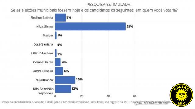 Na Pesquisa Estimulada, em que são apresentados os nomes dos candidatos, com base nas pré-candidaturas divulgadas até o momento, a pesquisa perguntou. Se as eleições municipais fossem hoje, e os candidatos fossem os seguintes: Em quem você votaria? A prefeita Nilza Simas aparece com 53% das intenções de voto. O ex-prefeito Rodrigo Bolinha tem 8%; Andre Oliveira 6%; Coronel Feres (PL) 4%; Hélio José Baschera (PV) 1%; Matiolo (PT) 1%; José Santana (PTB) 0%, Brancos e Nulos 15%; Não Sabem ou não responderam 12%.