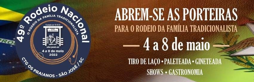 Entre 04 e 08 de maio, São José, na Grande Florianópolis (SC) será o palco de mais uma grande festa tradicionalista: o 49º Rodeio Nacional do CTG Os Praianos. O evento engloba competições artísticas e campeiras, gastronomia típica da culinária gaúcha, shows e bailes, exposição comercial, parque de diversão, apresentação de animais adestrados e muito mais.