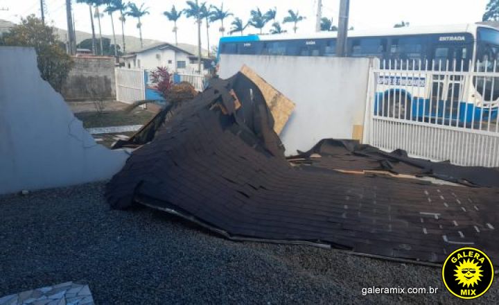 A força do vento em Porto Belo arrancou um telhado de uma residência na rua Adulce Garcia, no bairro Sertão de Santa Luzia, na tarde desta quinta-feira (13). Segundo relatos, a estrutura caiu no terreno entre duas casas, e ainda, quebrou o muro de uma das residências. Apesar do susto, ninguém ficou ferido.