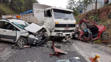 Um acidente envolvendo 9 veículos deixou motoristas e passageiros feridos e bloqueou a BR 470 na região de Ibirama na manhã desta quarta-feira (24). Segundo informações uma caçamba que descia a serra perdeu o controle na curva, invadiu a pista contrária e colidiu em 8 veículos. As três vítimas mais graves estavam em GM/Celta placas de Ibirama.